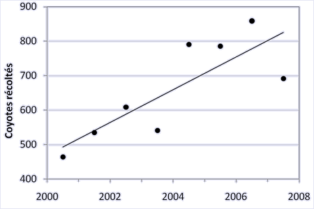 Figure 5. Évolution du nombre de coyotes récoltés annuellement en Montérégie, 2000-2008; la droite est une régression linéaire. Données tirées des statistiques de piégeage du MNRF, https://www.mrnf.gouv.qc.ca/faune/statistiques/chasse-piegeage.jsp.