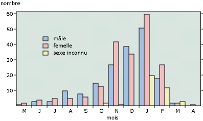 On donne une synthèse des résultats dans le texte, et on expose ceux-ci plus en détails dans un diagramme (ici, un histogramme) qui permet de visualiser d’un simple coup d’oeil l’ensemble de ces résultats. Vous remarquez donc que cette figure ne fait pas que montrer le nombre de coyotes (répartis selon les sexes) en fonction des mois de l’année mais qu’elle permet de dégager rapidement que novembre, décembre et janvier sont les mois les plus importants. Un tableau présentant les mêmes résultats permettrait certes au lecteur de tirer les mêmes conclusions, mais au prix d’un effort de lecture et d’interprétation beaucoup plus grand. En fait, les valeurs précises des nombres de coyotes récoltés à chaque mois ne présentent aucun intérêt ici.